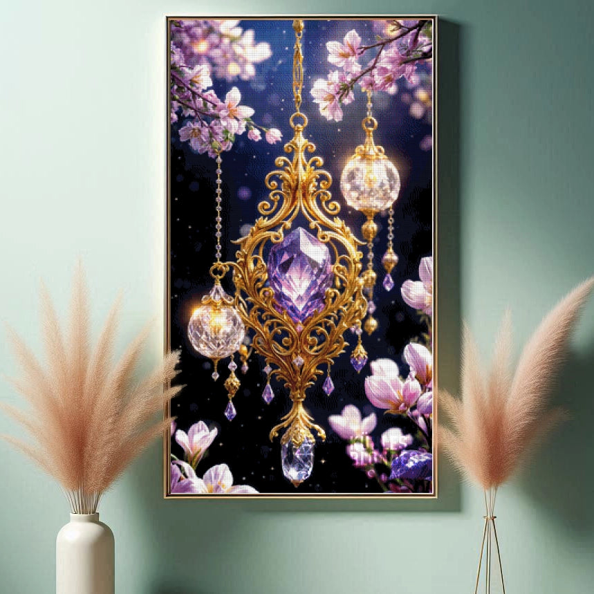 Umrahmt wird dieses Prachtstück von zarten Blüten und kristallklaren Laternen, die vor dem dunklen Sternenhimmel leuchten. Der Kontrast ist hier der absolute Wahnsinn: Das tiefe Dunkelblau des Hintergrunds lässt das Gold und Lila förmlich aus der Leinwand springen. Ein absolut hochwertiges Motiv, das jeden Raum veredelt.
