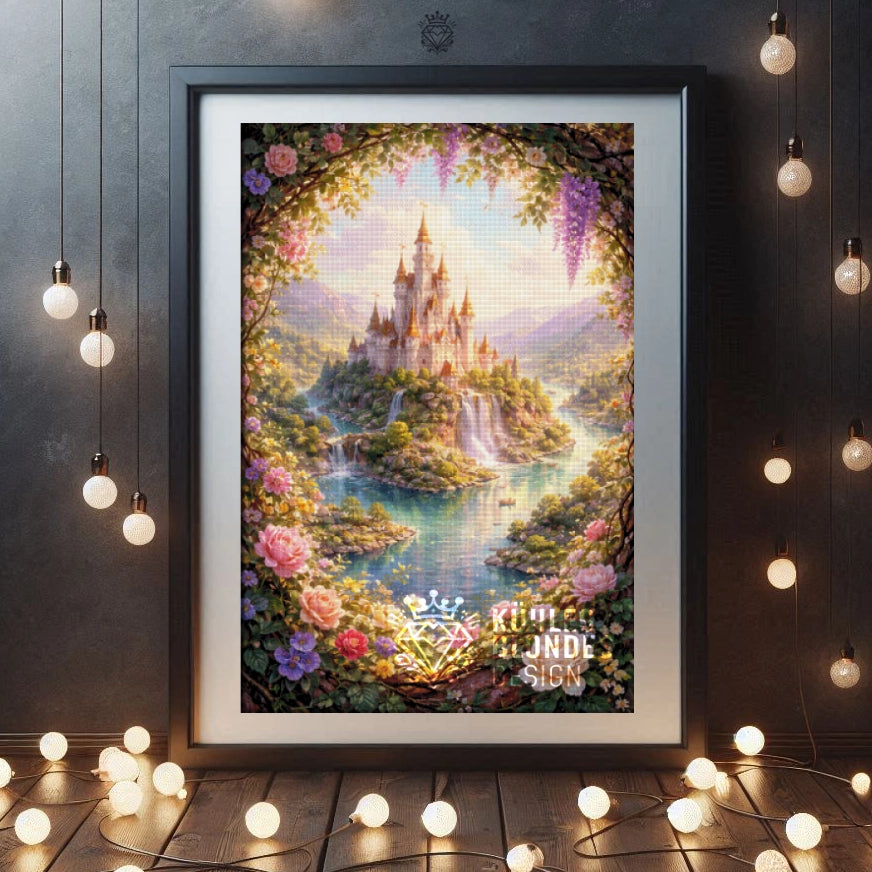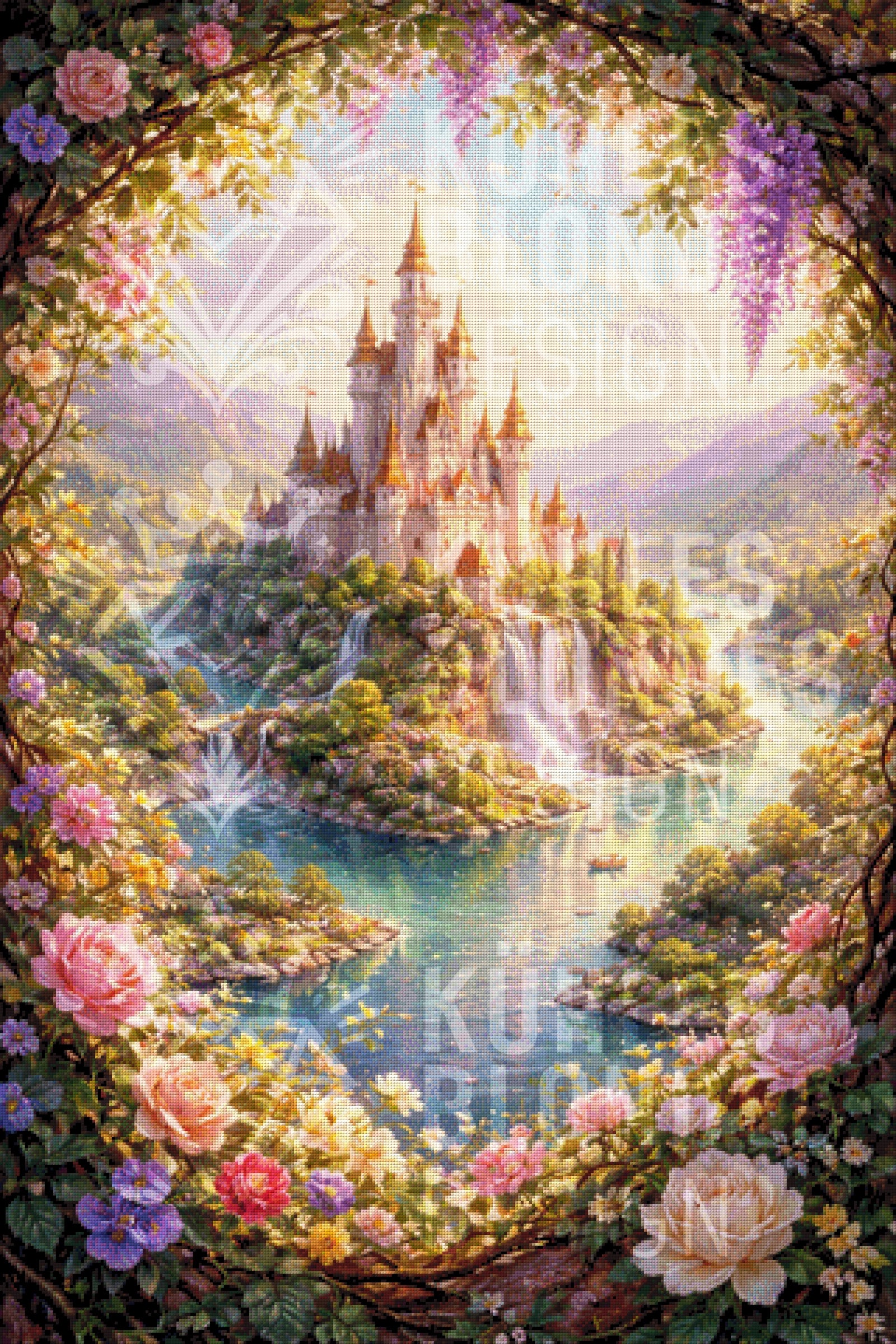 Der „Blick ins Märchenland“ verzaubert durch seine Farben: Sanftes Lila, frisches Rosa und das beruhigende Türkis des Wassers. Es macht unglaublich viel Spaß, sich erst durch das Blumenmeer zu arbeiten, bis man schließlich das goldene Schloss erreicht.