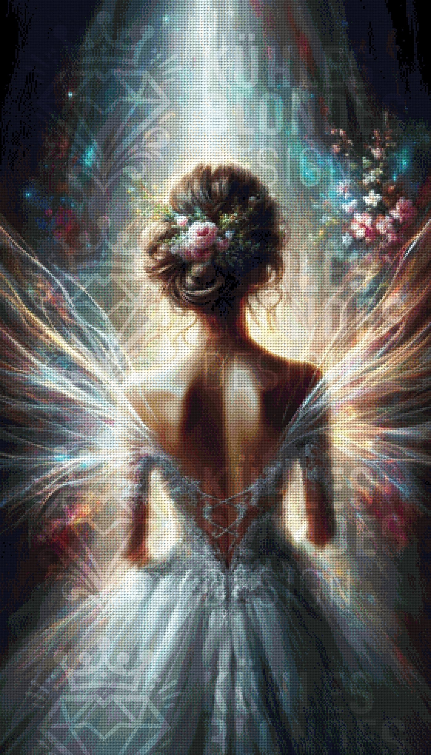Die Rückansicht mit den detailverliebten Blumen im Haar und dem eleganten Kleid verleiht dem Bild etwas Geheimnisvolles. Ist sie eine Braut am Altar oder ein Engel, der gerade landet? Das entscheidest du! Besonders der helle Lichtstrahl in der Mitte sorgt beim Painten für pure Abwechslung zu den dunklen, mystischen Rändern.