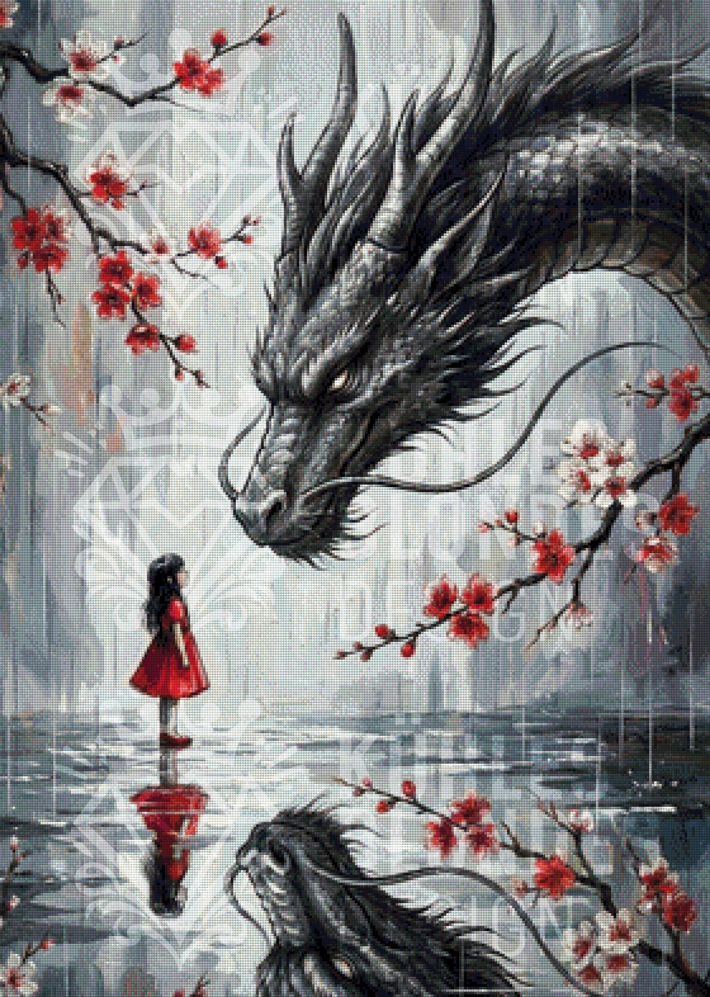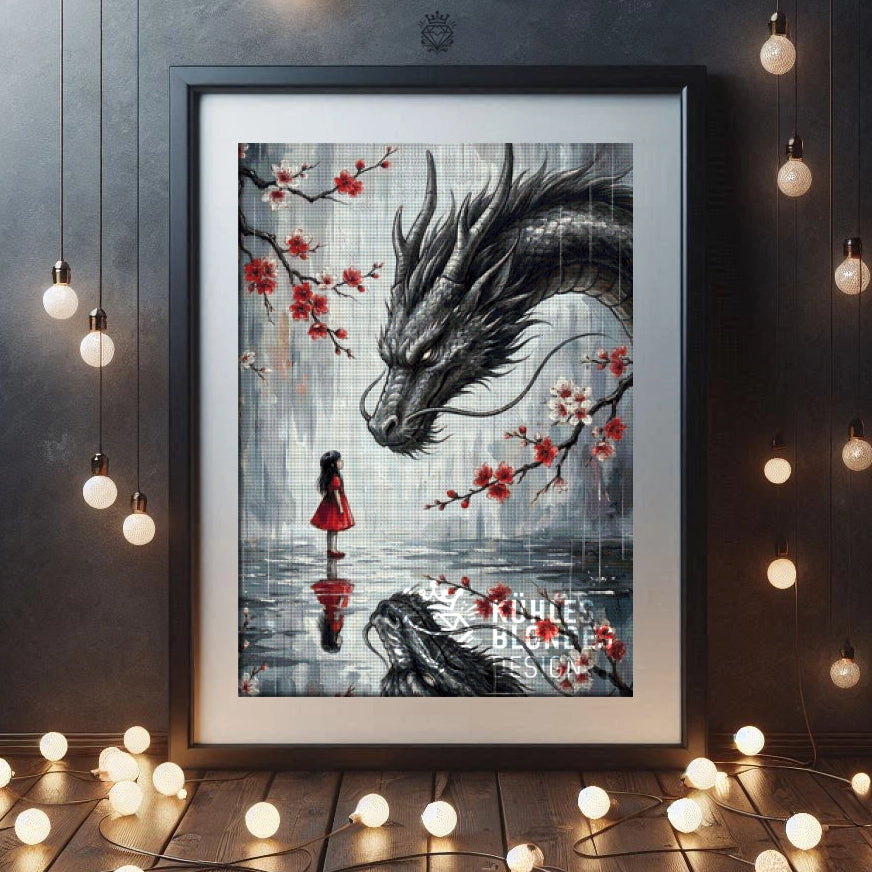 Das kleine Mädchen im leuchtend roten Kleid steht dem riesigen, mächtigen Drachen ganz ohne Furcht gegenüber. Der „Color-Pop“-Effekt bei diesem Diamond Painting ist grandios: Während der Drache und der Hintergrund in mystischen Grau- und Silbertönen gehalten sind, stechen das Rot des Kleides und die Kirschblütenzweige förmlich heraus. Besonders schön ist auch die Spiegelung im Wasser am unteren Bildrand – ein Detail, das beim Painten richtig Spaß macht!