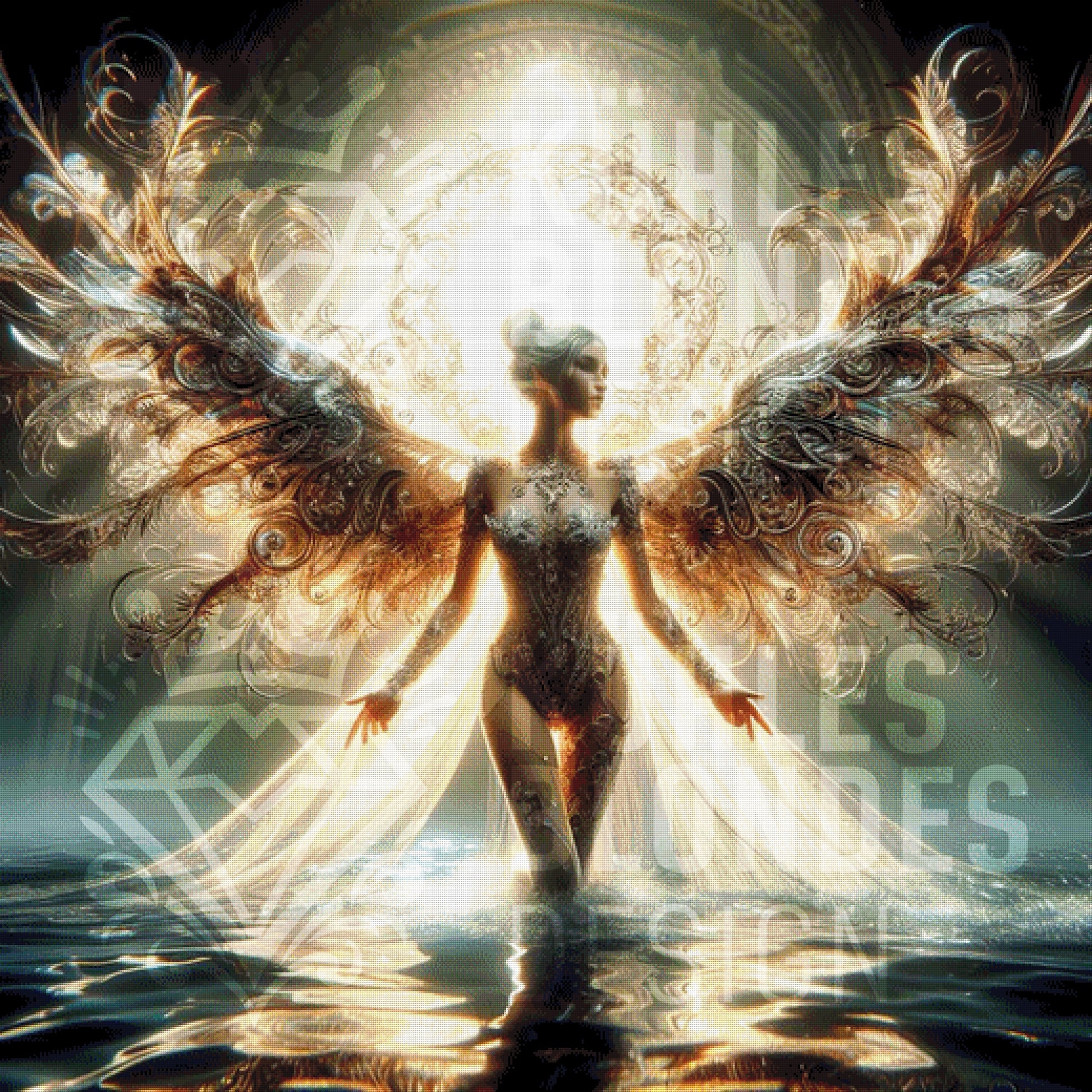 In atemberaubender Größe von 130 x 130 cm entfaltet sich hier eine Engelsgestalt von unfassbarer Schönheit. Die riesigen, filigranen Flügel wirken wie aus flüssigem Gold und Bronze geschmiedet. Das Licht, das von hinten strahlt und sich im Wasser spiegelt, sorgt für eine göttliche Atmosphäre. Hier paintest du Licht, Wasser und pure Anmut.