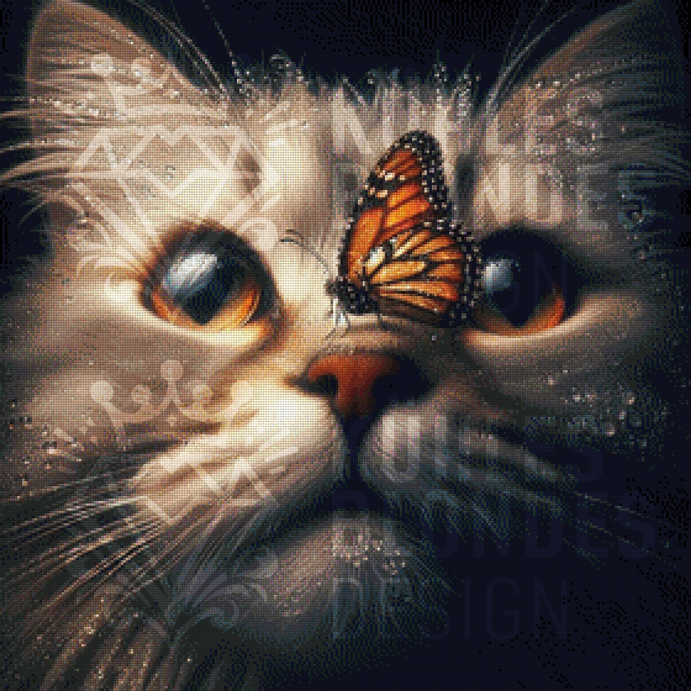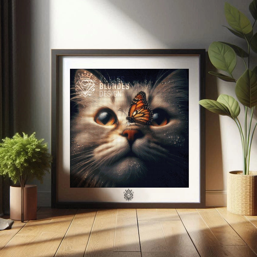 Eine majestätische Katze, ein zarter Monarchfalter und ein Moment puren Vertrauens. Die Details bei diesem Diamond Painting sind atemberaubend: Du paintest jedes einzelne feine Haar des Fells, die leuchtenden Bernsteine in den Augen und natürlich die prächtigen orangefarbenen Flügel des Schmetterlings. Die dunklere, mystische Beleuchtung sorgt dafür, dass die Katze und ihr kleiner Besucher förmlich aus der Leinwand herausstrahlen.
