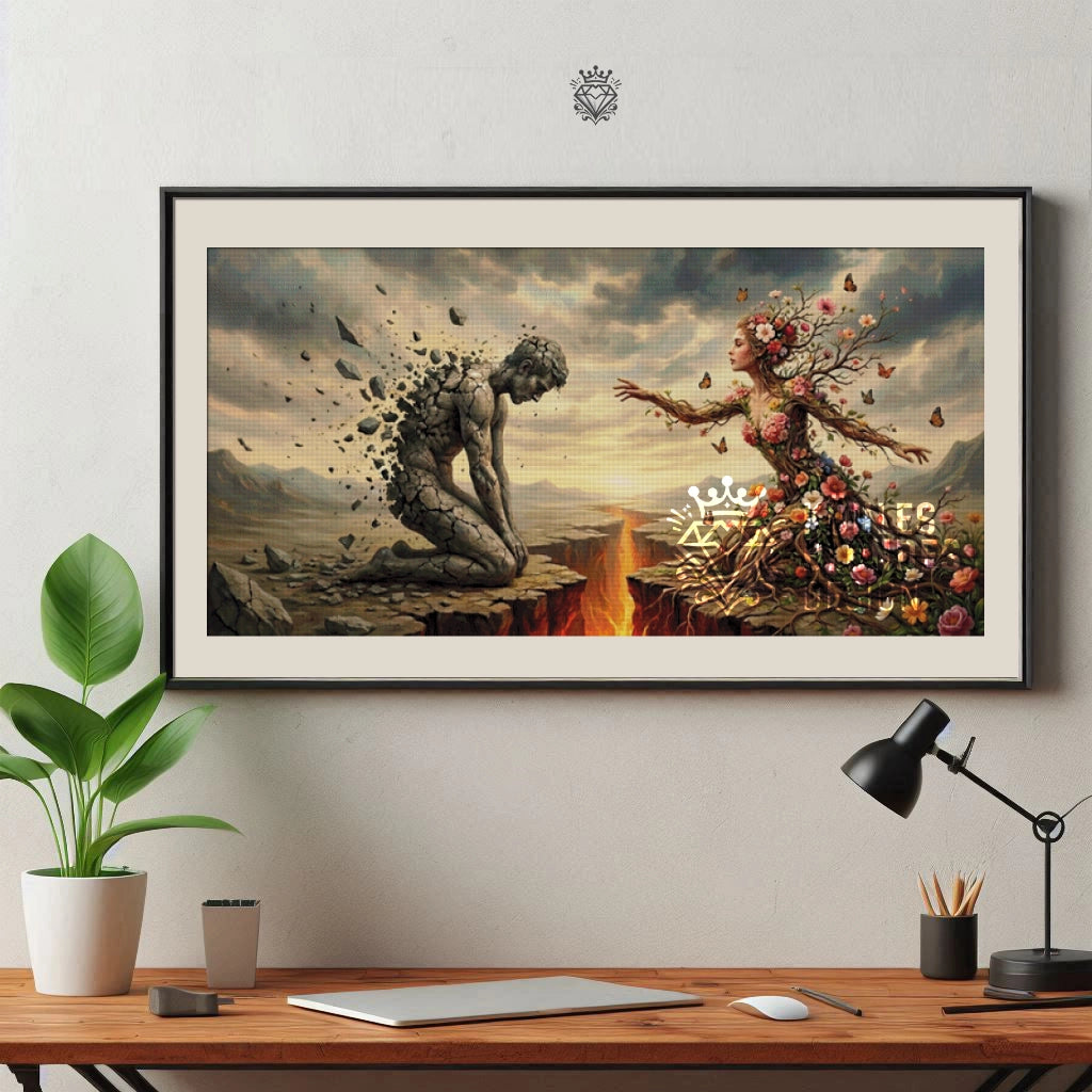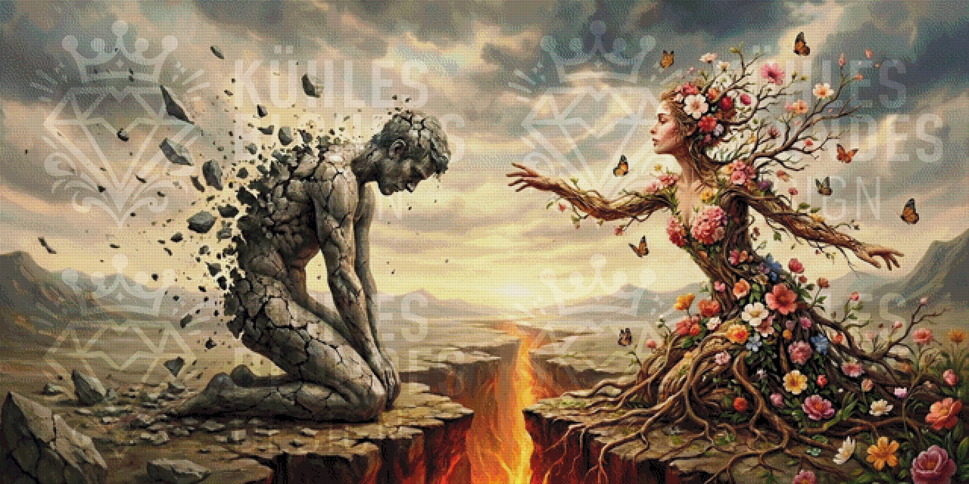 Während er in sich zusammenfällt, streckt sie sich ihm entgegen, um ihn mit der Kraft der Natur zu heilen. Die Details sind der Wahnsinn: Die fliegenden Steinsplitter, die zarten Schmetterlinge und die Lava, die tief unten glüht. Ein Diamond Painting für alle, die Bilder mit Seele suchen.