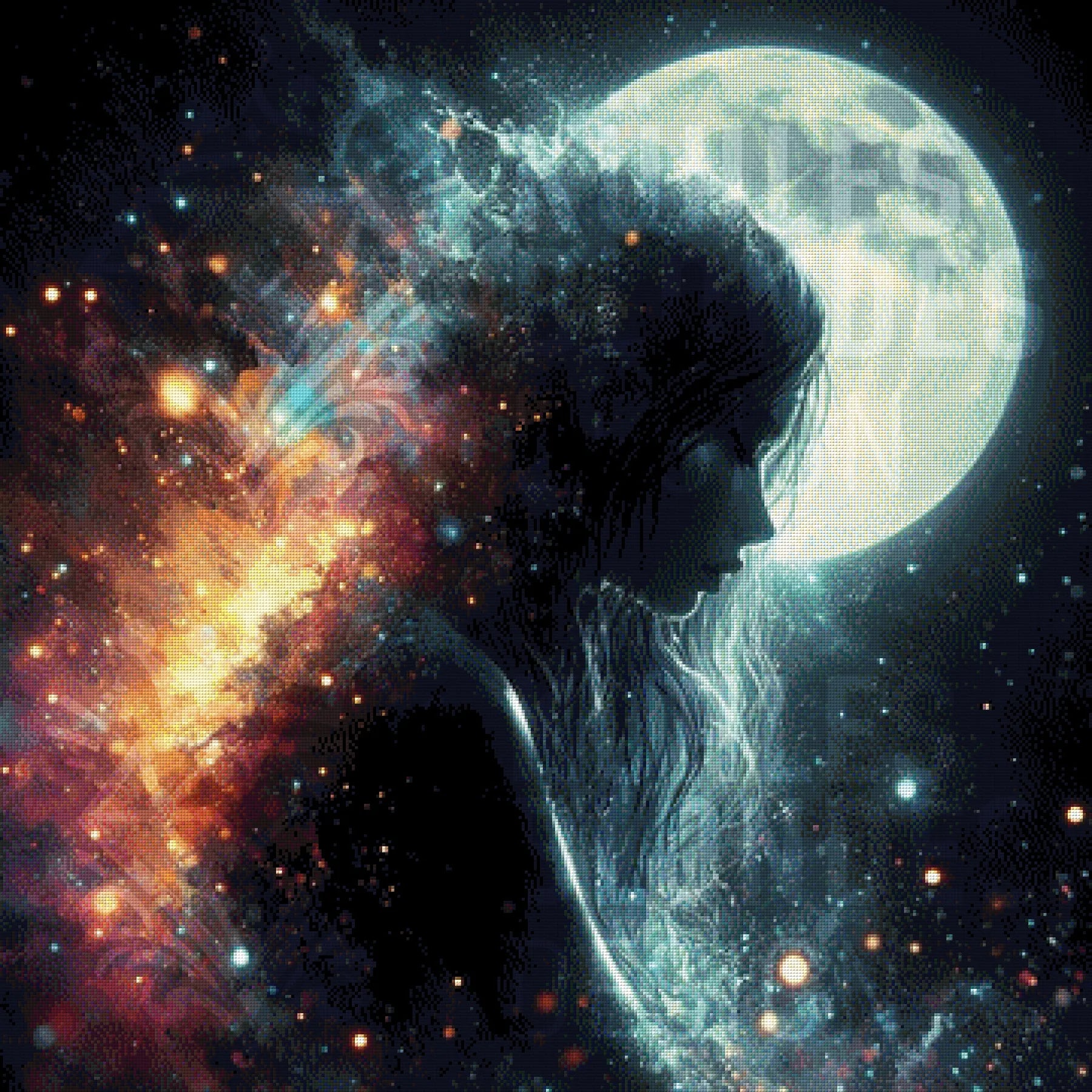 Lass dich von einer sanften, verträumten Traurigkeit umarmen, während sich die zarte Silhouette in diesem Motiv wie von Zauberhand in leuchtenden, kosmischen Sternenstaub aufzulösen scheint. Mit jedem gesetzten Glitzerstein fängst du die tiefgründige Melancholie des Bildes ein und erschaffst ein funkelndes Universum, das auf magische Weise Trost und Schönheit zugleich spendet. Ein wunderschönes, emotionales Projekt, um einfach mal die Seele baumeln zu lassen und sich beim Painten im stillen Glanz des Mondes zu verlieren!