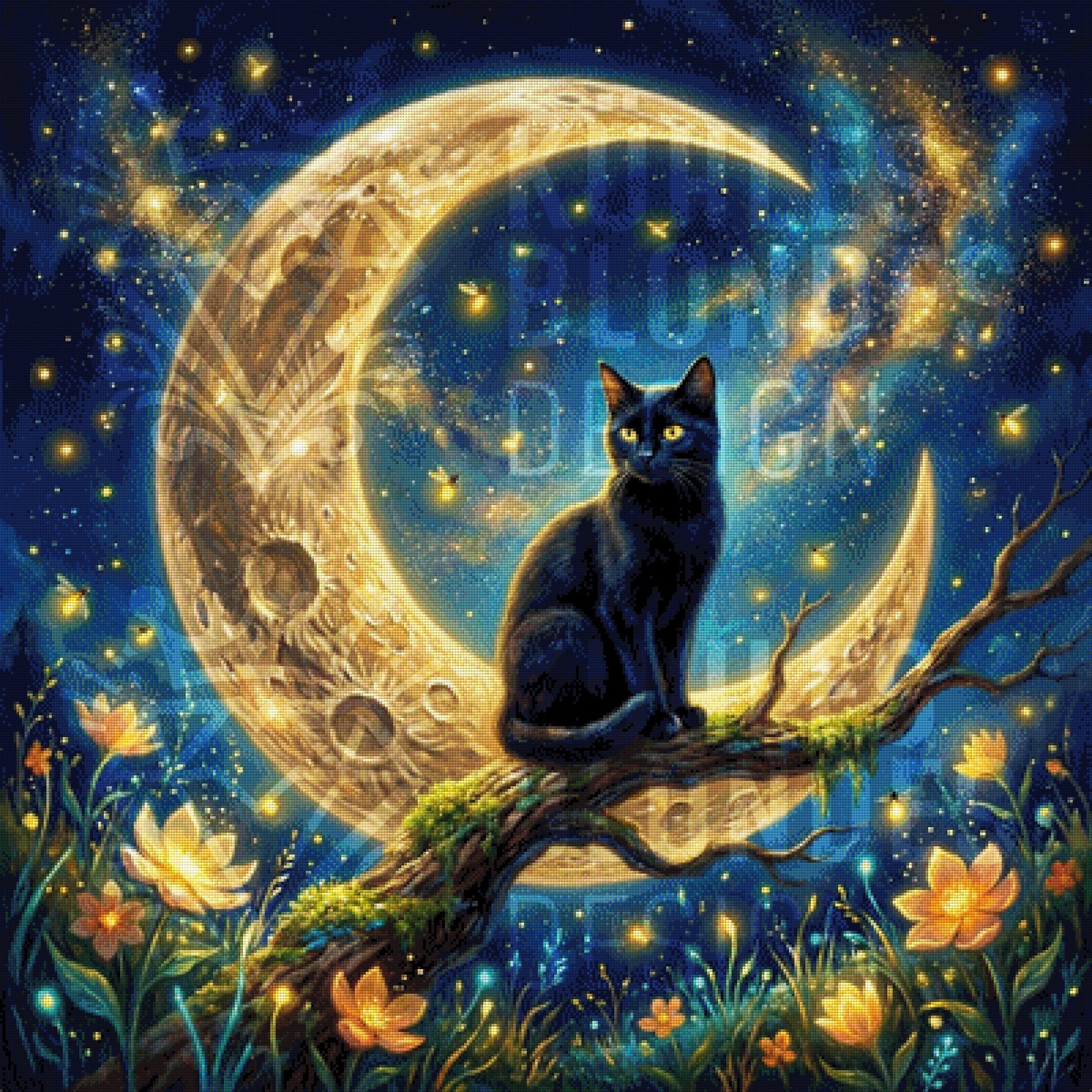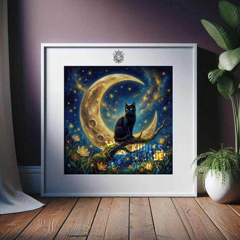 Thronend auf einem gigantischen, goldenen Halbmond wacht diese stolze schwarze Katze über ihre Sternenwelt. Der Kontrast ist hier das absolute Highlight: Das tiefe, mystische Blau des Himmels lässt das Gold des Mondes und die gelben Blüten förmlich strahlen. Ein Bild voller Ruhe und Geheimnisse – perfekt, um beim Painten den Alltag komplett hinter sich zu lassen.