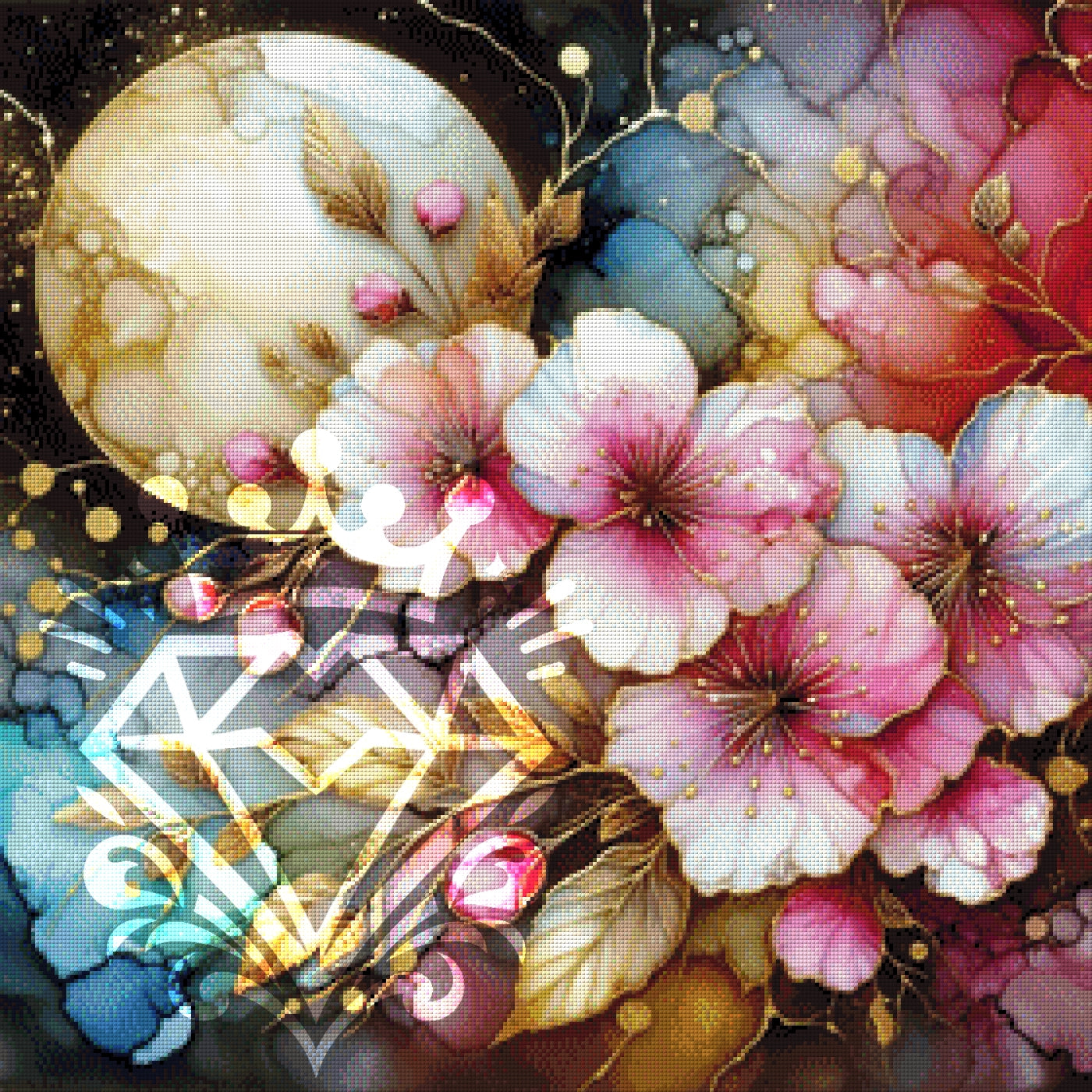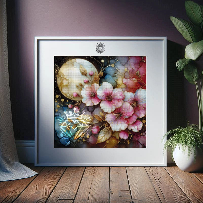 Lust auf eine Portion himmlischen Glanz für Deine Wände? Mit unserem Kit "Cherryblossom Night" fängst Du die Magie einer warmen Frühlingsnacht ein! Die zarten rosa Blüten treffen auf einen geheimnisvollen goldenen Mond und fließende Tinte, was ein echtes Fantasy-Feuerwerk für die Seele ergibt. Die goldenen Linien und der schimmernde Mond sorgen für extraviel Glitzer-Faktor, während die traumhaften Rosa- und Blautöne beruhigend und glücklichmachend wirken.