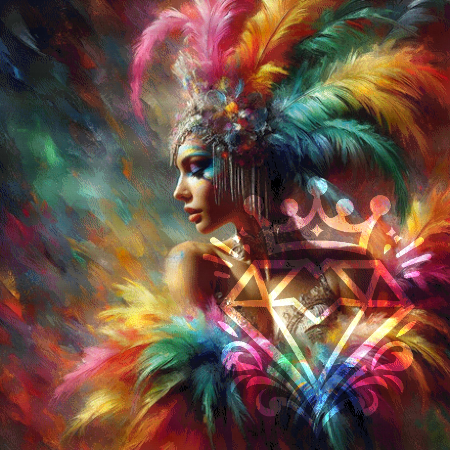Tauche ein in ein Meer aus funkelnden Farben und erwecke diese glamouröse Federpracht zum Leben. Mit jedem Diamanten, den du setzt, gibst du dieser Tänzerin mehr Schwung und holst dir die pure Lebensfreude direkt an deine Wand.