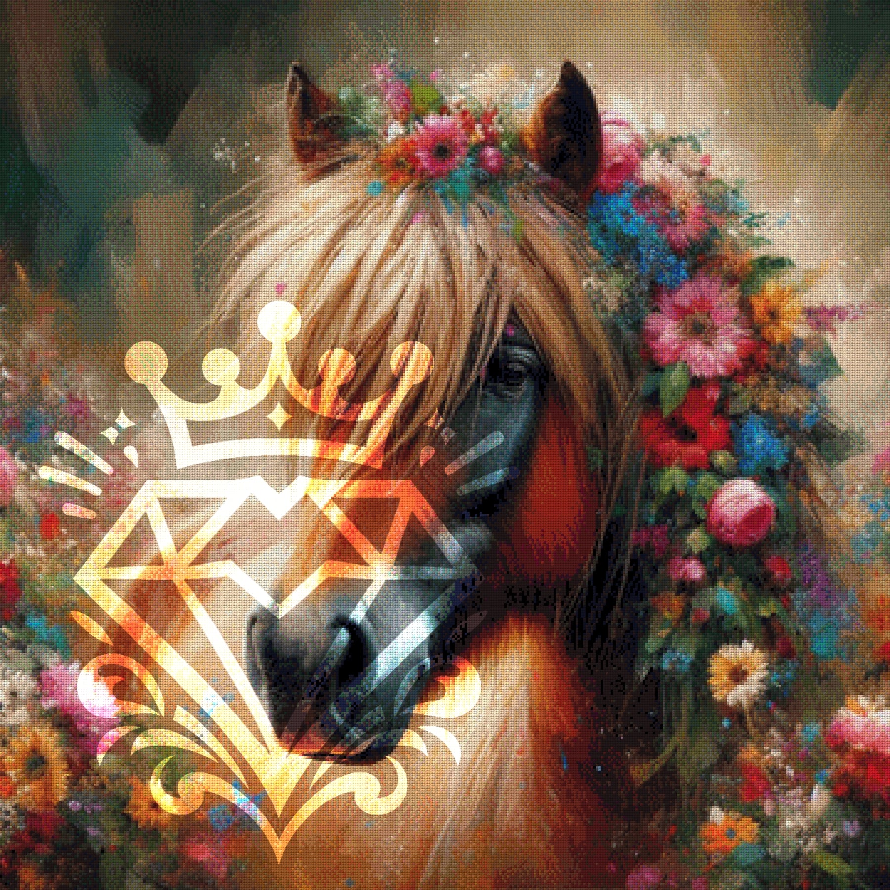 Die lockere, fast gemalte Pinselstrich-Optik und die unzähligen, farbenfrohen Blüten bieten ein abwechslungsreiches und entspannendes Klebeerlebnis. Jeder funkelnde Stein bringt die Mähne und die Blumen zum Strahlen.