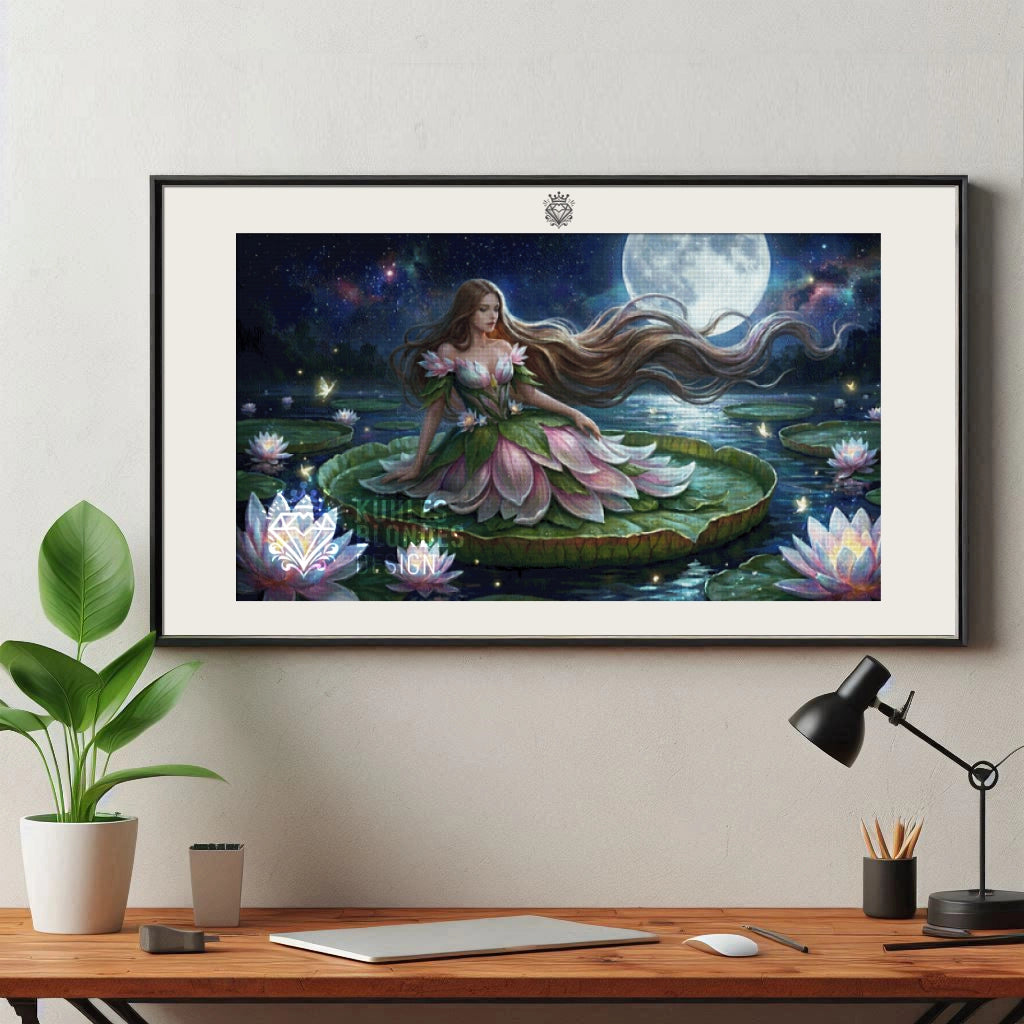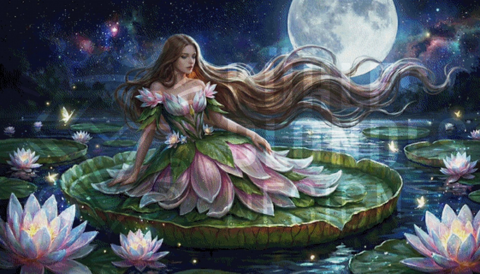 Komm mit an den verzauberten See! Unser Motiv „Mondschein-Nymphe“ entführt dich in eine klare Vollmondnacht. Sieh dir nur dieses Blütenkleid an!