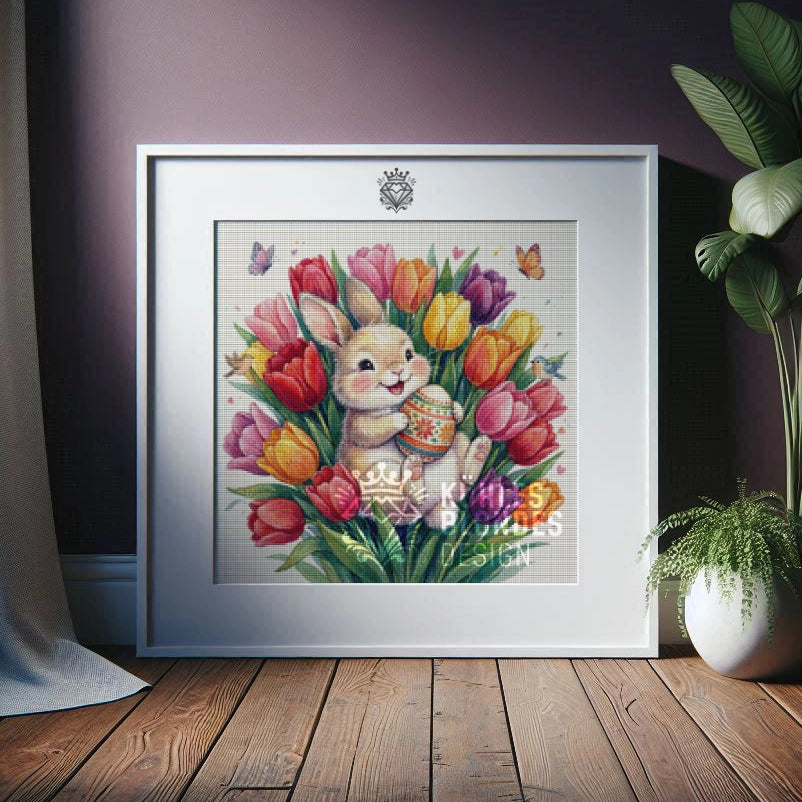 Inmitten eines riesigen Bouquets aus bunten Tulpen sitzt dieser süße Hase und hält stolz sein schönstes Osterei fest. Dieses Motiv macht einfach Spaß: Die kräftigen Farben der Blüten (Rot, Gelb, Lila, Pink!) leuchten um die Wette, und kleine Details wie die Schmetterlinge und das Vögelchen machen das Bild perfekt.