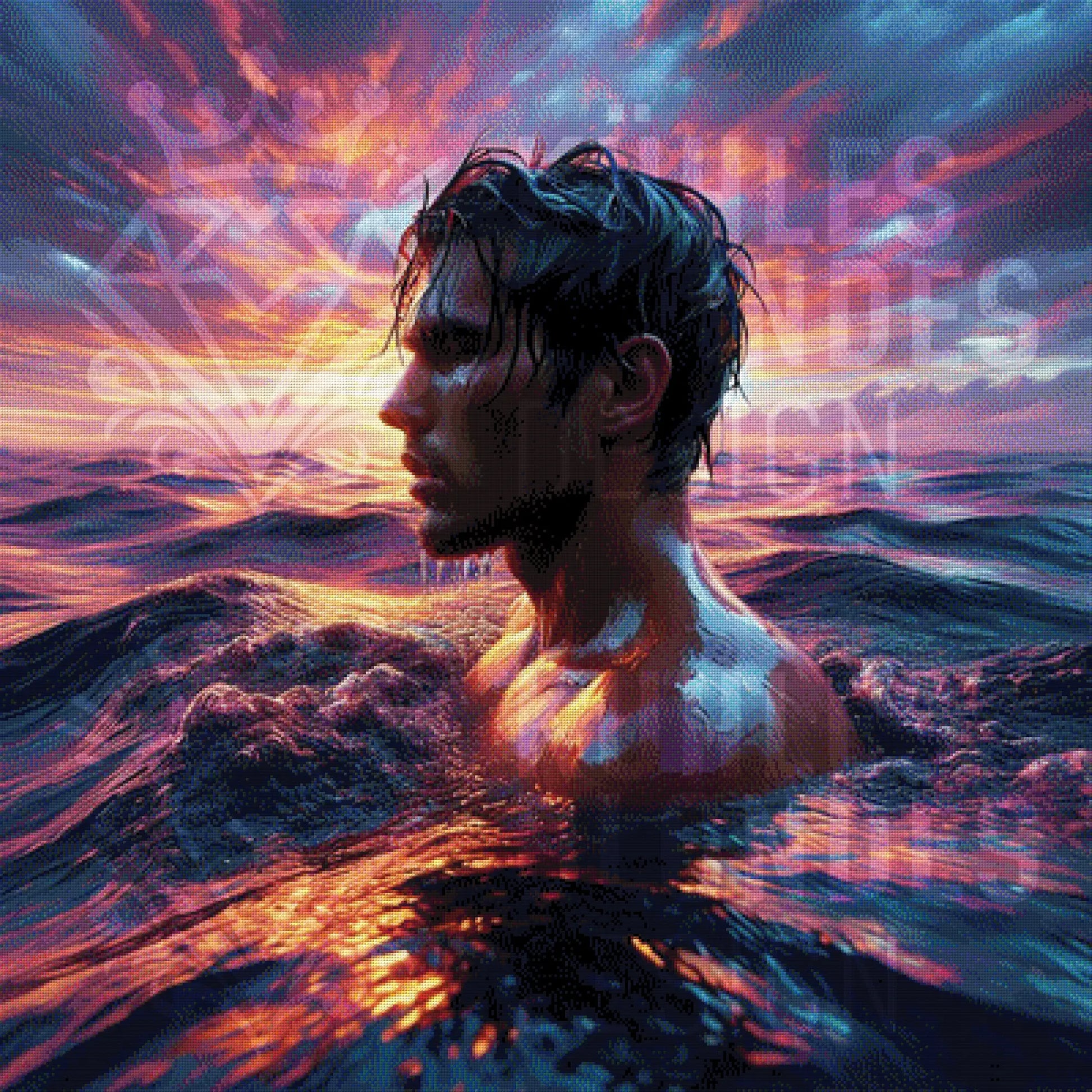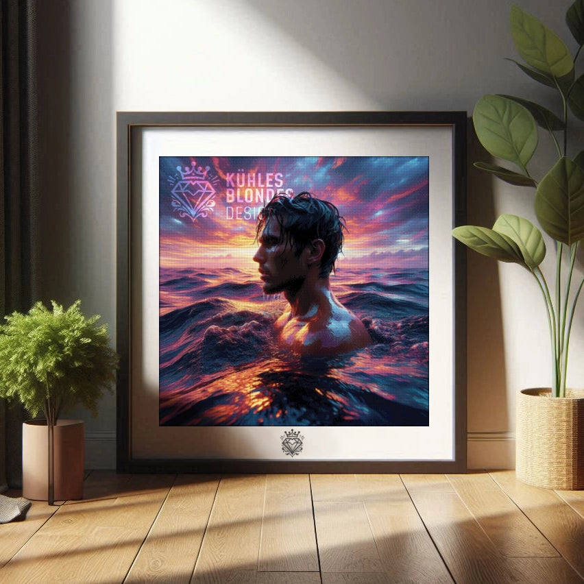 Was für ein atemberaubendes Farbenspiel: Erlebe, wie tiefe Indigo-Wellen auf einen flammenden Sonnenuntergang treffen! Bringe dieses kraftvolle Portrait eines Schwimmers, dessen nasse Haut das goldene Licht einfängt, Stein für Stein zum Funkeln. Erschaffe ein funkelndes Kunstwerk voller Tiefe und Poesie, das jeden Raum verzaubert.