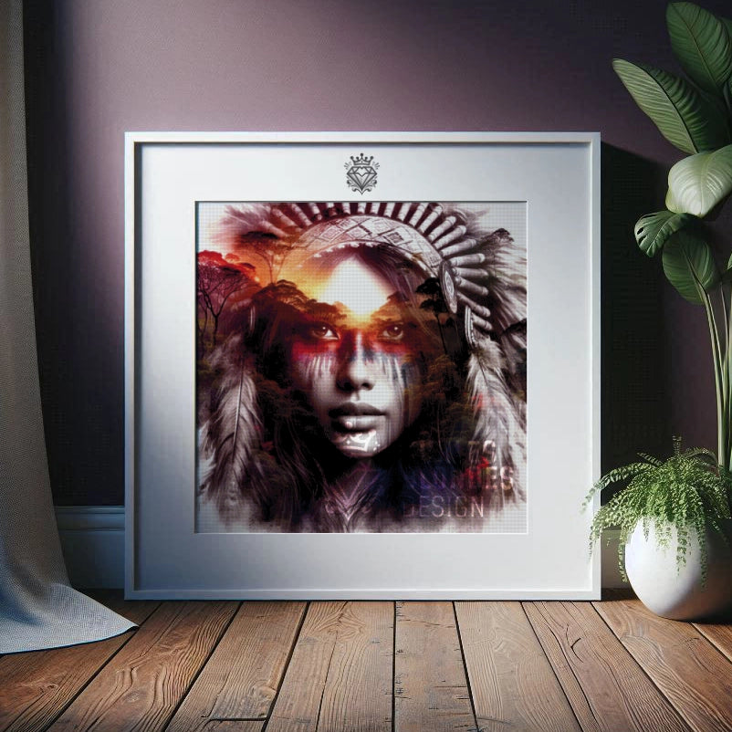 Dieses beeindruckende Porträt verschmilzt die majestätische Präsenz einer stolzen Kriegerin mit der ungezähmten Schönheit der Wildnis. Während du Stein für Stein setzt, offenbart sich ein faszinierendes Doppelbild, in dem dichte Wälder und die warme Glut eines Sonnenuntergangs direkt in ihrem Blick zum Leben erwachen. Der detailreiche Kopfschmuck und die erdigen Farbtöne verleihen diesem Diamond Painting eine tiefe, fast spirituelle Energie. Erschaffe ein funkelndes Symbol für die unzertrennliche Verbindung zwischen Mensch und Natur, das in jedem Raum eine kraftvolle und mystische Atmosphäre verbreitet.