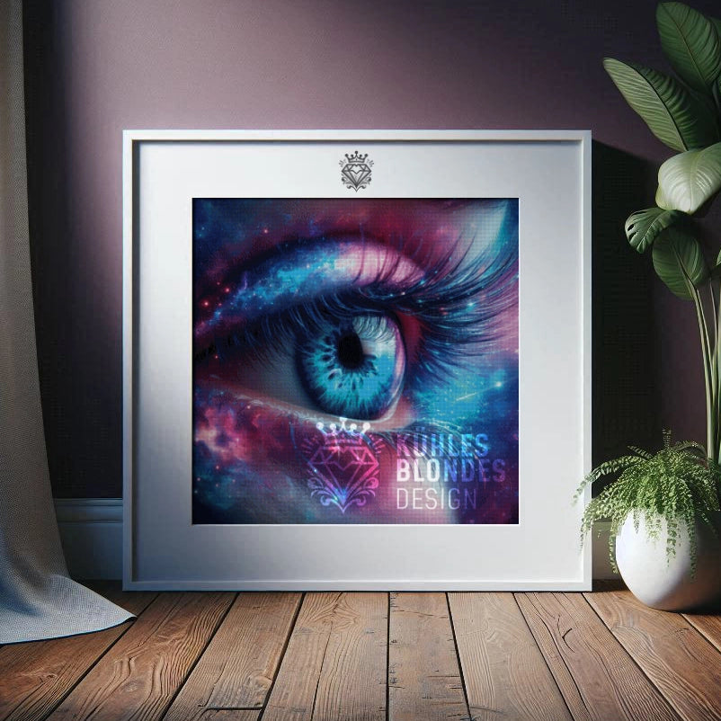 Bewundere die Details: Eine Iris, die wie eine leuchtend blaue Galaxie strahlt, umgeben von wirbelnden pinken und violetten Sternennebeln, die sich sanft auf die Haut und Wimpern legen. Ein hypnotisierendes Kunstwerk, das deine Wände zum Funkeln bringt.